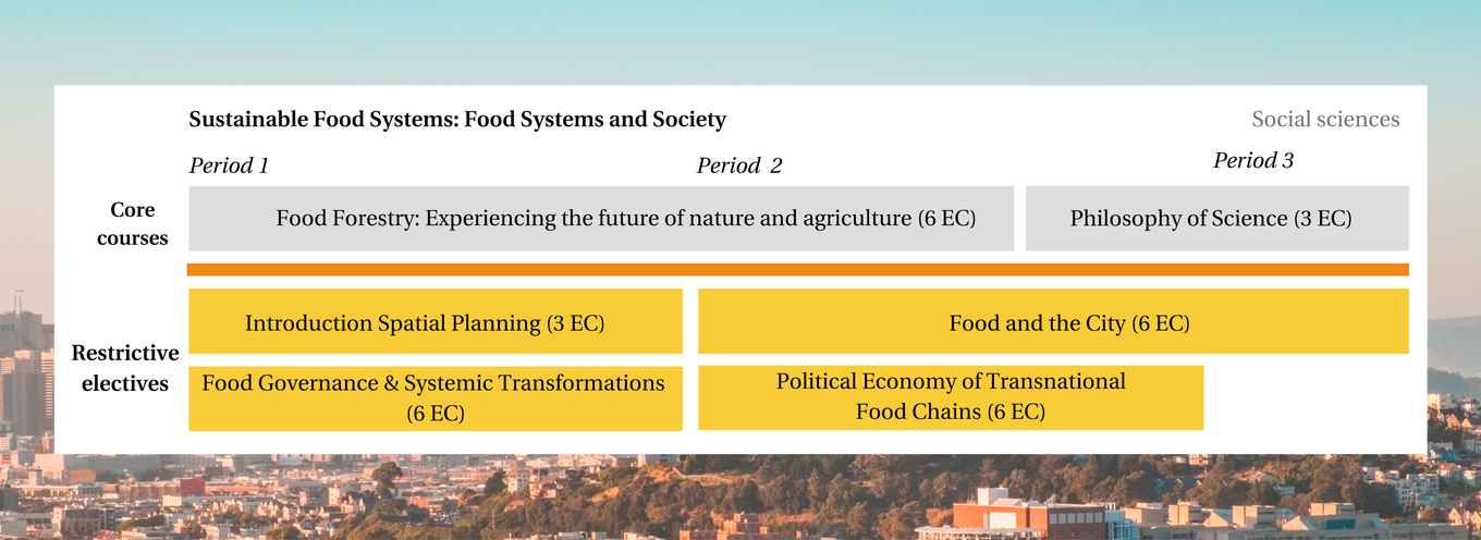 Food systems are a big part of our society, both urban and rural. In this track you will focus on different urban food systems and the role they play in producing, processing, acquiring, distributing and consuming food. Through disciplines like political science, human geography and urban planning you will learn about how the current food system can transform into a more sustainable one. The first period will focus on governance and system innovation perspectives in relation to food (production). The second and third block will delve into transnational food production, provision and consumption from global and local value chains. Throughout the semester you will work on individual and group assignments relating to alternative food systems and solutions for food production issues in our society.