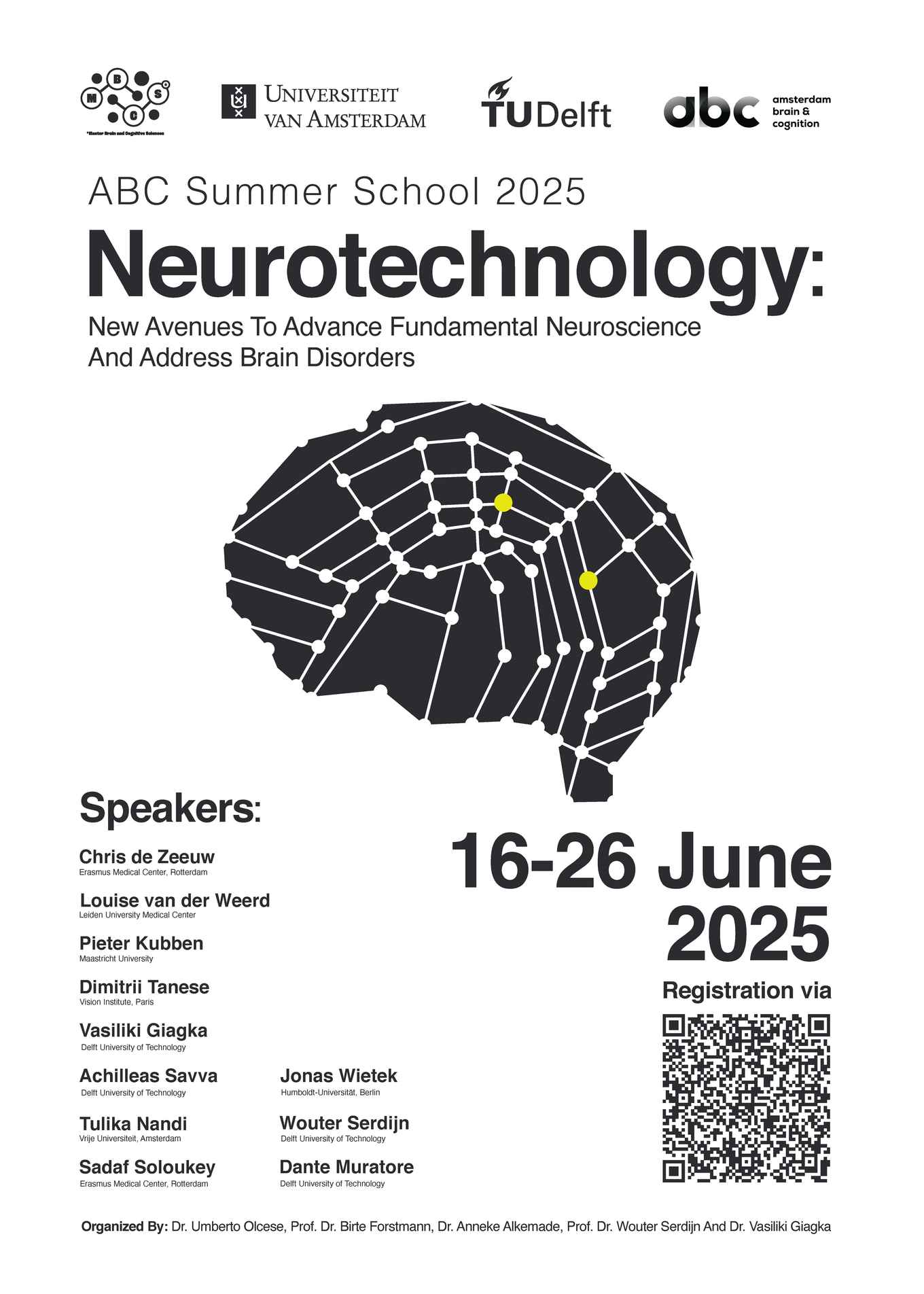 Topics that will be covered are high-resolution imaging methods, new probes for large-scale electrophysiology, methods to selective modulate neural activity and close-loop approaches. All topics will be addressed with a multi-scale, cross-species perspective. During workshops, students will have the opportunity to dive deeper into selected topics and get hands-on experience. The Summer School culminates in an International Symposium on the future avenues of neurotechnology. This summerschool is organized by dr. Umberto Olcese (SILS, University of Amsterdam), prof. dr. Birte Forstmann (Brain & Cognition, University of Amsterdam), dr. Anneke Alkemade (Brain & Cognition, University of Amsterdam), Prof. dr. Wouter Sedijn (Bioelectronics, Delft University of Technology), and dr. Vasiliki Giagka (Bioelectronics, Delft University of Technology)