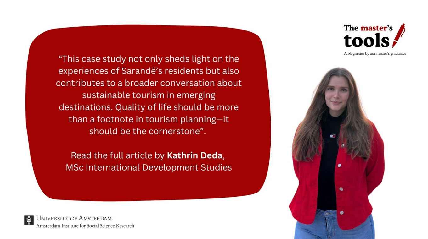 My master’s thesis, completed as part of the MSc in International Development Studies at the University of Amsterdam, explores this dynamic by asking: How do residents of Sarandë perceive tourism’s impact on their Quality of Life (QOL)? Sarandë, a coastal city in southern Albania, has experienced a dramatic tourism boom in recent years, becoming a focal point for discussions around economic opportunity, cultural preservation, and sustainable development.