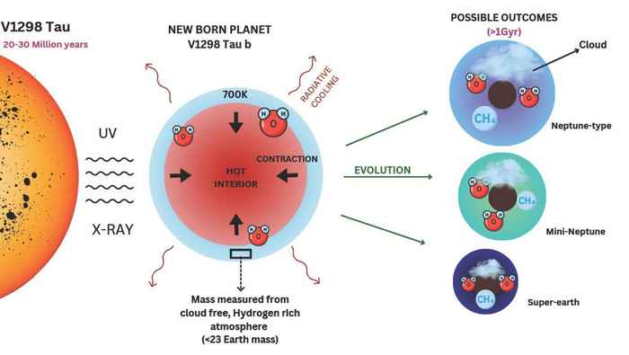 In hun artikel in Nature Astronomy onthullen hoofdonderzoekers Jean-Michel Desert en zijn promovendus Saugata Barat (beiden van de Universiteit van Amsterdam) de enigszins verrassende resultaten van de eerste transmissiespectrumanalyse van de atmosfeer van zo'n jonge planeet. Hun bevindingen onthullen een heldere en uitgestrekte atmosfeer van ongeveer 1000 kilometer, die voornamelijk bestaat uit primordiale waterstof en helium, met sporen van waterdamp. Deze samenstelling en structuur verschillen aanzienlijk van de atmosferen die we aantreffen bij hemellichamen in het zonnestelsel, zoals Titan. De atmosfeer van Titan beslaat slechts ongeveer 50 kilometer en wordt gedomineerd door zwaardere elementen zoals koolstof en zuurstof. De samenstelling van de atmosfeer van V1298 Tau b verschilt ook aanzienlijk van die van de meer ontwikkelde planeten, met een factor 100.