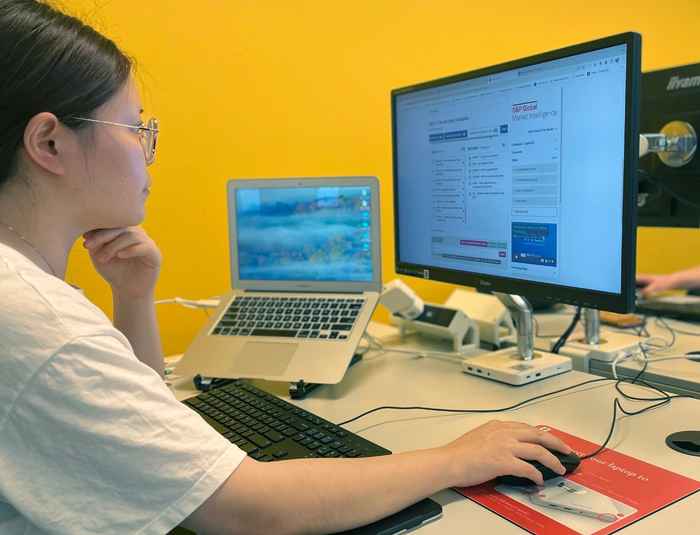 In gebouw REC-H zijn nu drie verschillende studieruimtes. Op de eerste verdieping vind je een flexibele studiezaal die op verschillende manieren kan worden ingericht: van individuele studieplekken naar een samenwerkingsruimte. Op de tweede verdieping is een ruimte met video belkappen, waar studenten online colleges kunnen volgen of online kunnen samenwerken. En nu op de derde verdieping kunnen studenten gebruikmaken van individuele studieplekken met grote monitoren.
