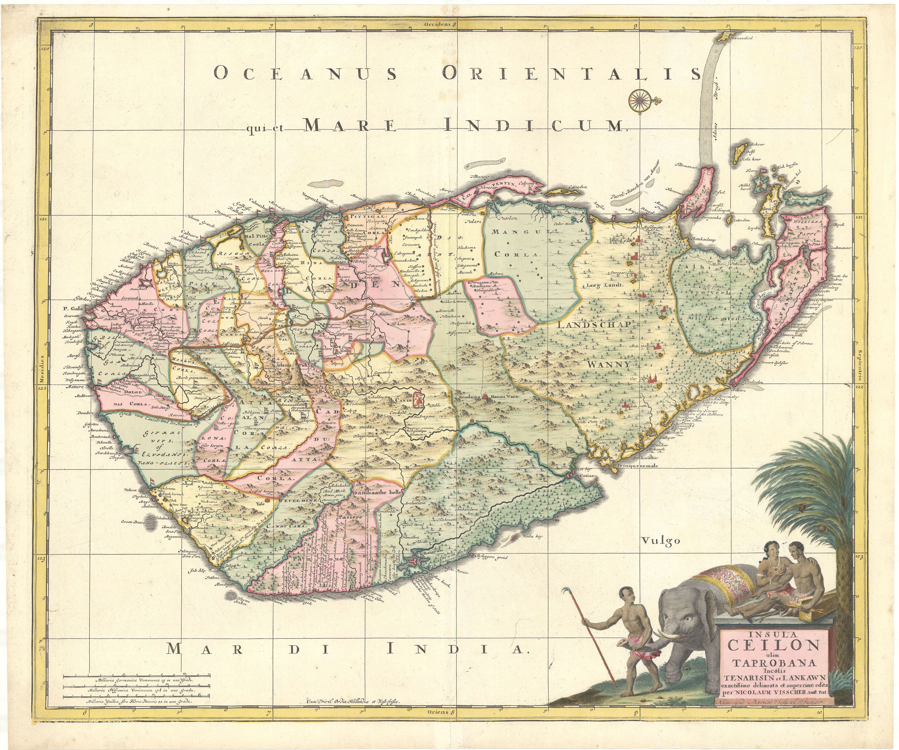 Deze kaart van Sri Lanka is een herdruk door de Amsterdamse uitgever van kaarten Peter Schenk Jr. van een oudere kaart door Nicolaes II Visscher (1649-1702).