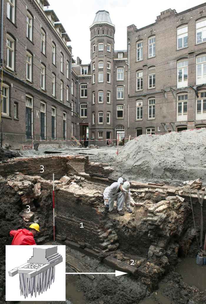 Met de start van het graven in de binnentuin van de Tweede Chirurgische Kliniek in de zomer van 2019, startte Monumenten en Archeologie (MenA) van de gemeente Amsterdam het archeologisch onderzoek. Hierbij werden de resten teruggevonden van het 17e-eeuwse Sint Pietersgasthuis evenals restanten van gebouwen uit de kloosterperiode. Op basis van nadien uitgevoerd jaarringenonderzoek van het funderingshout (dendrochronologie) kan deze oudste bebouwing worden gedateerd rond 1560. Dit gebouw was gemetseld op een zogeheten roosterfundering, een constructie waarbij een houten raamwerk – het rooster – werd vol geheid met palen. Deze bouwwijze zien we vooral terug bij zware bouwwerken zoals kerken en verdedigingswerken, maar ook wanneer - zoals in de Amstelbocht -werd gebouwd op een drassig, opgehoogd land. In 1589, nadat de kloosters in 1578 waren opgeheven, is dit gebouw onderdeel gaan uitmaken van het Pesthuis en in 1626 het ‘Verbandhuys’, een chirurgische afdeling van het Sint-Pietersgasthuis. Deze oude bebouwing maakte rond het midden van de 18e eeuw plaats voor een geheel nieuw opgetrokken ‘Verbandhuys’, dat hier heeft gestaan tot 1897.