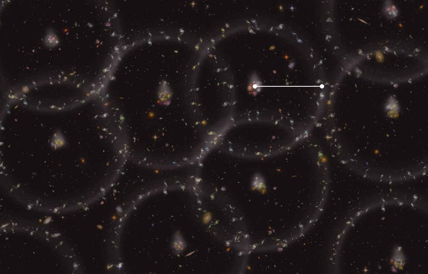 Als je een steentje in het water gooit, ontstaan er kleine rimpelingen die in cirkels naar buiten bewegen. Op een soortgelijke manier ontstonden er in het oer-plasma in het vroege heelal, rond de regionen met de hoogste dichtheid, schillen van materie (vooral protonen en elektronen) die naar buiten toe bewogen met bijna de snelheid van het licht. Dit naar buiten duwen van de materie was een gevolg van het grote aantal hoog-energetische fotonen – lichtdeeltjes – in het vroege heelal.