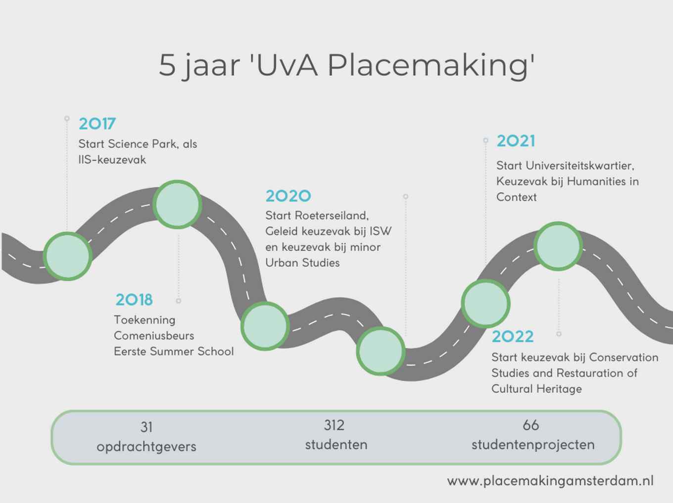 In 2017 heeft het Instituut voor Interdisciplinaire Studies (IIS) aan de UvA de filosofie en methodiek van placemaking omgezet naar een keuzevak gericht op de koppeling van theorie, beleid en uitvoering van Placemaking. Studenten leren interacteren met de (sociale) omgeving door zich onder te dompelen in hun eigen campusgebied. Binnen deze cursus werken studenten op transdisciplinaire wijze samen met een opdrachtgever aan een maatschappelijke plaatsgebonden uitdaging, waarbij aspecten van stedelijke ontwikkeling als participatie, ontwerpprincipes, ecologische principes en bestuurlijk-juridische kaders uitgangspunten vormen voor analyse en transformatie. Op basis van onderzoek initiëren studenten - in co-creatie met de belangrijkste betrokkenen - een interventie op locatie, waarmee ze onderzoeken hoe deze kan bijdragen aan verbetering van het gebied. Placemaking kent bovendien een estafette-element: studenten uit meerdere lichtingen werken veelal voor dezelfde opdrachtgever(s) en maken hierbij gebruik van kennis en inzichten van de eerdere groep. Zo bouwen studenten voort op het betreffende gebiedsdossier.