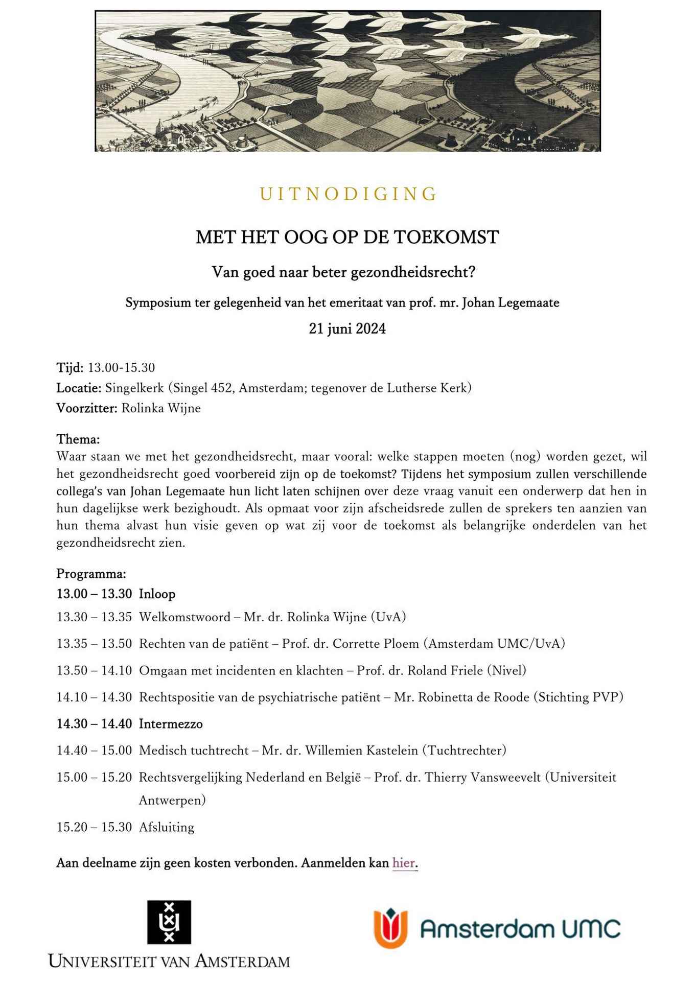 Op 21 juni neemt Johan Legemaate officieel afscheid van het Amsterdam UMC en de juridische faculteit van de Universiteit van Amsterdam met een afscheidscollege in de Aula Lutherse Kerk, om 16u30. Voorafgaand aan dit afscheidscollege vindt een symposium plaats genaamd “Met oog op de toekomst: Van goed naar beter gezondheidsrecht?”. Dit symposium ter gelegenheid van het emeritaat van prof. Mr. Johan Legemaate wordt gehouden van 13.00-15.30 in de Singelkerk (Singel 452).