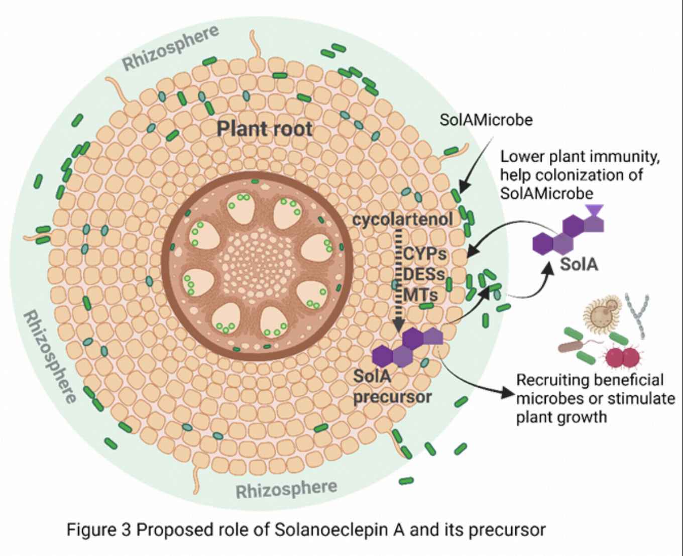 Intriguingly, in the work on solanoeclepin A, we discovered that signaling molecules secreted by plant roots can be further modified by root-associated microbes and we set out to decode these complex metabolic conversations. The model molecules we study are the triterpenoid eclepins. One of these, solanoeclepin A (SolA) was initially discovered as a host cue for parasitic cyst nematodes. Surprisingly, we unveiled that SolA constitutes a hybrid molecule requiring both plants and their root-associated microbes to be produced. We postulate that this must mean that SolA has a role other than just being a host cue for nematodes. In a number of projects funded by an EU-Marie Curie fellowship (Nemhatch), NWO-TTW, and NWO-VIDI, by combining multidisciplinary approaches in molecular biology, biochemistry and genetic engineering, we elucidate the biosynthetic pathway of SolA and other eclepins. Using omics-data analysis and microbiological approaches, we reveal the identity of the microbe(s) involved in its production (SolAMicrobe). In addition, we are uncovering the evolutionary benefit of SolA and other eclepins on plant fitness, and on colonization by microbes and nematode infection.