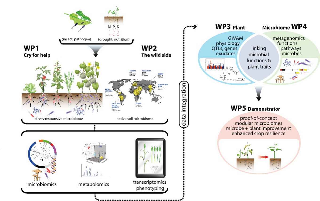 In the Gravitation project Microbial Imprinting for Crop Resilience MiCRop, together with partners in other Dutch Universities/Institutes, we investigate the role of the plant in the recruitment of beneficial micro-organisms under stress. We do this with 100 plant species across the 5 agriculturally most important plant families. In all these studies we use advanced omics approaches, data integration and modelling to try to discover new relationships between plants and beneficial micro-organisms.