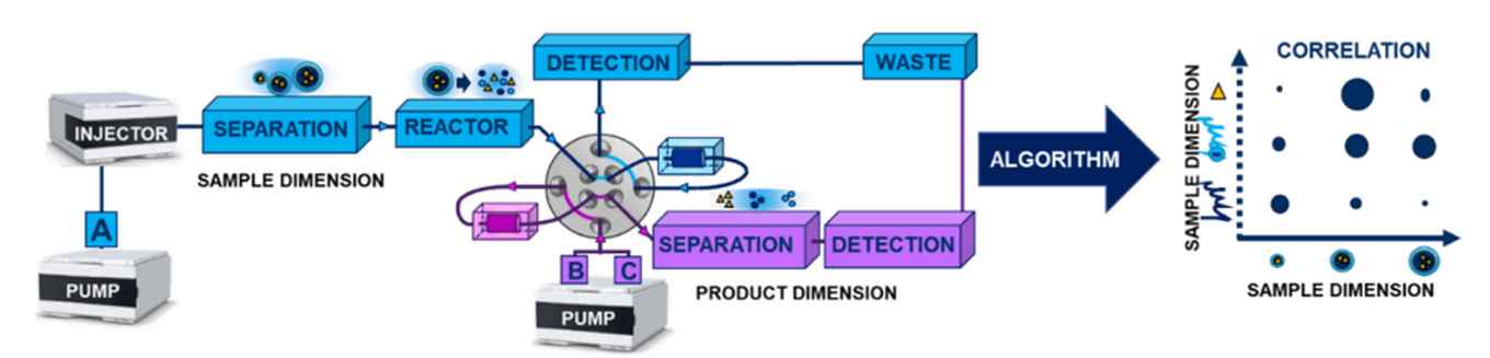 The approach draws inspiration from the popular technique of 'comprehensive two-dimensional liquid chromatography' (LC×LC). Here, individual fractions resulting from a first LC separation are further analysed with a second 'orthogonal' LC analysis. Doing so drastically increases the separation power. However, to obtain meaningful results, there is a need for an intermediate modulation step that modifies the products of the first LC step so that they can be analysed in the second LC method.