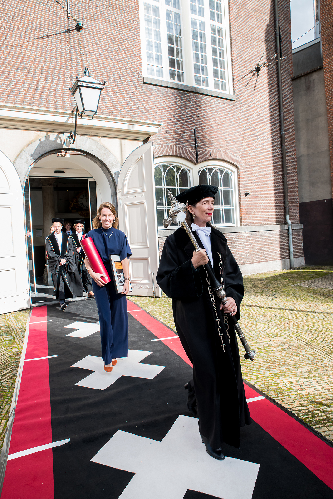 The graduates and their guests entered the Aula or the Agnietenkapel via a ‘red carpet’, where they were welcomed by the beadle. After a word of welcome by the dean of their faculty or director of their department, present in a gown, the PhD graduates were shown a video specially made for them. They were then addressed by their supervisor(s) and the PhD certificate was awarded. After the official ceremony there was a (seated) reception.