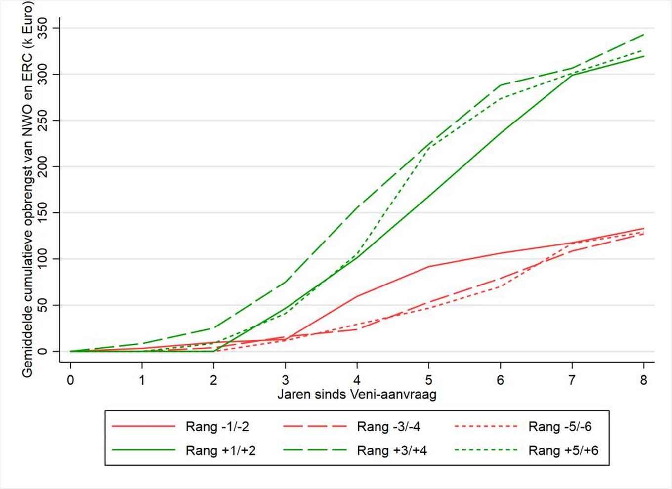 In the years following a Veni application, the gap between the winners and near-winners continues to grow. After eight years, winners are two times more likely than near-winners to receive research funding from the NWO and its European equivalent, the European Research Council (ERC).